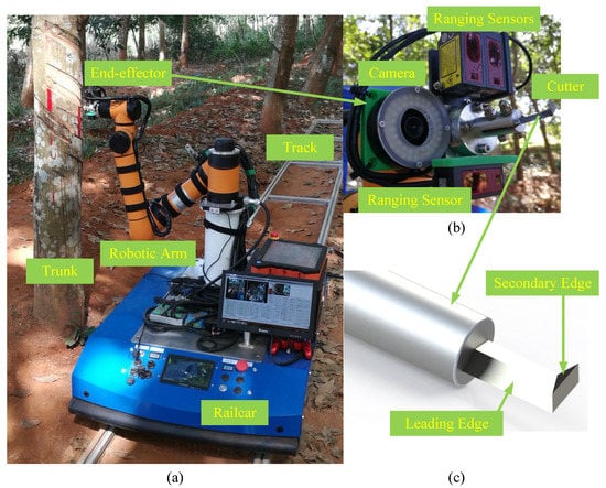 Figure 3a depicts the rubber-tapping robotic system, which was deployed in a natural rubber plantation. In order to facilitate the operation, parallel tracks were installed in front of the rubber tree rows, and a railcar was used to carry the six-joint robotic arm along the track. To ensure precise detection of the cutting line, a binocular stereo vision system, composed of two cameras and light sources, was mounted on the robotic arm. Moreover, a highly integrated end effector was designed to assist the arm, as shown in Figure 3b. This end effector incorporated laser distance sensors and a hand–eye camera to accurately locate the cutting line’s starting point. Laser sensors were also utilized to control the feed during the cutting process. Furthermore, Figure 3c illustrates some detailed features of the cutter, which included a horizontal leading edge and a secondary edge to effectively remove the bark. The tool was made of durable tool steel, while the base was constructed from lightweight aluminum alloy. Our previous work [] provides a more detailed description.