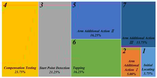 Prior to each cutting operation, the Bluetooth IMU was activated via the smartphone, enabling the system to initialize and synchronize the hardware components. Upon the mobile platform stopping in front of the target trunk, the cutting operation commenced, and the entire process took approximately 80 seconds to complete. This duration included the initial locating stage, the cutting movements, and the additional actions of the robotic arm during the two-step detection–cutting operation, as outlined in []. The cutting process involved seven distinct stages, namely, initial locating, arm additional action I, start point detection, compensation testing, arm additional action II, tapping, and arm additional action III. As described in Section 2.1, the cutting trajectory is optimized as a continuous curve with multiple interpolations. Figure 5 illustrates the percentage of time spent in each stage. The actual cutting action occurs in the sixth stage, tapping, which occupied 16.25% of the total time, while the IMU recording covered all stages of the cutting process. In particular, varying the cutting parameters does not result in a change in time consumption.