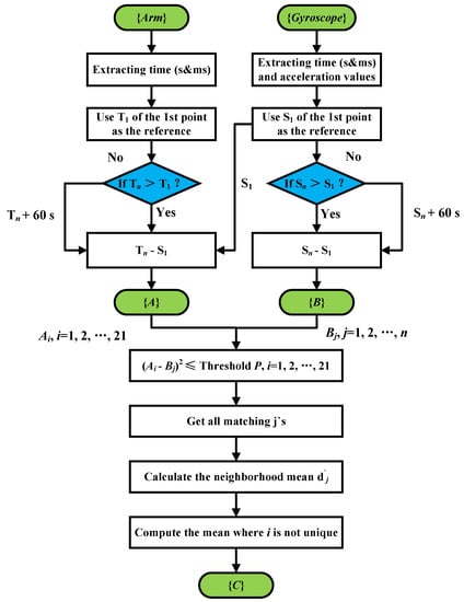 Subsequently, a crucial step in the analysis involved the merging of the data present in matrices and . The 21 rows in corresponded to the 21 interpolation points, which played a pivotal role in accurately assessing the cutting process. Furthermore, the value in was meticulously examined, and it was observed that the minimum value of j exceeded 130, indicating that there were ample time points from to execute the proposed algorithm. The assessment of the square of the difference between and was conducted, and the outcomes were subsequently compared with a predetermined threshold p. The threshold value p was manually adjusted to ensure that all were appropriately matched, while minimizing the number of required for the matching. Given the high frequency of Bluetooth sensor sampling, it was found that almost no time points in could correspond precisely to the interpolated point records in . To address this issue and ensure the accuracy of the measurements, a meticulous approach was employed. Specifically, the average acceleration data within the neighborhood was meticulously examined to provide more nuanced insights into the cutting process. To this end, the neighborhood radius was set to 2, and the average was obtained from Equation (2), which allowed for the systematic and precise assessment of the data while minimizing any potential inaccuracies: