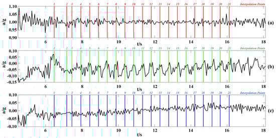 Temporal correspondence between the interpolation points and the acceleration changes at the robotic arm’s end. (a) The correspondence of the X axis. The red line indicates the relative time of the interpolated points. (b) The correspondence of the Y axis. The green line indicates the relative time of the interpolated points. (c) The correspondence of the Z axis. The blue line indicates the relative time of the interpolated points.