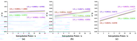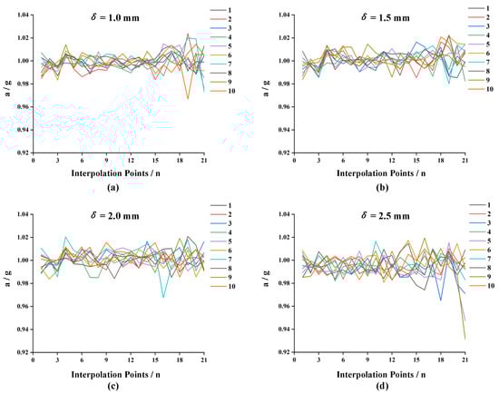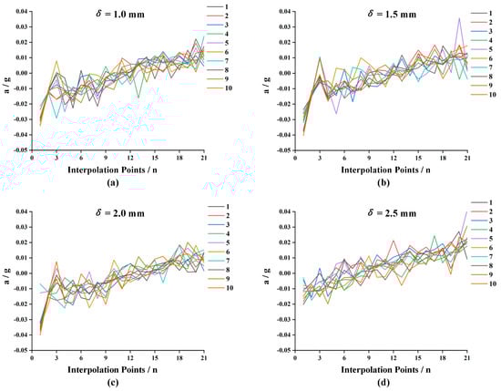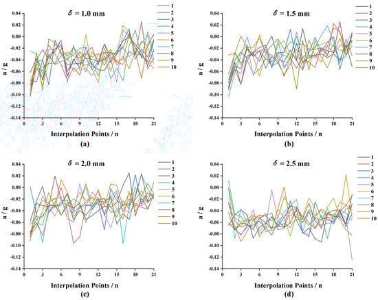 Furthermore, to gain deeper insights into the patterns of acceleration variation, a linear fit was made to the variation of accelerations over the three measurement axes (see Figure 11). The changes in acceleration values at 21 interpolated points on the same axis were fitted to a straight line. The resulting slope changes of the fitted lines were then compared to identify any discernible patterns. On the X axis, all four fitted straight lines were observed to be almost horizontal (see Figure 11a), consistent with the trend depicted in Figure 8. The fourth line (2.5 mm) showed a slight deviation from the other lines, exhibiting a negative slope. For the Y axis, the first three lines showed a clear upward trend, with the last straight line (2.5 mm) exhibiting a minor upward trend (see Figure 11b). These trends were more pronounced than those in Figure 9, making the comparison clear. Finally, on the Z axis, all lines showed a clear upward trend and were close to parallel (see Figure 11c), which was consistent with the trend depicted in Figure 10. However, the fourth line (2.5 mm) was significantly higher than the other lines due to a more significant intercept. This difference cannot be easily seen in Figure 10, and additional data support is needed to explore the reasons for the fitted results.