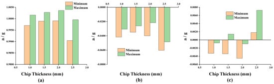 Table 3 presents comprehensive statistics for the acceleration values on the three axes. To ensure the accuracy, the mean values of acceleration at the 21 interpolation points were calculated for the four bark consumption settings in each trial. The experiment was repeated ten times to derive the overall averages and standard deviations, thereby minimizing accidental errors. The comparison between the groups was then carried out based on both the mean values and standard deviations of the acceleration measurements. The results show that, on both the X and Y axes, the acceleration values at the chip thickness of 2.5 mm setting are smaller compared to the other groups, consistent with the fit results depicted in Figure 11a,b. Additionally, for the Z axis, the mean values of the first three groups are negative, while the fourth group (2.5 mm) exhibits a positive mean value (0.0044 g). This observation is also confirmed by Figure 11c. Moreover, on both the X and Z axes, the standard deviation of the fourth group (2.5 mm) is larger compared to the other three groups, which have relatively smaller values. These comparison results are generally consistent with the fluctuations of the curves depicted in Figure 8 and Figure 10.