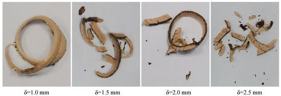 Figure 13 shows the chips collected. The measurements of the width, thickness, and weight of each chip are depicted in Figure 14. Specifically, in Figure 14a, the chip width displays a non-monotonic trend with bark consumption, initially increasing and then decreasing. The widest chips are observed when the bark consumption is set to 2.0 mm, with the fluctuations being most pronounced at the 1.5 mm and 2.5 mm settings. Additionally, Figure 14b highlights a tendency for the chip thickness to increase with the amount of bark consumption, with the curve of chip thickness gradually flattening as increases. The fluctuations of the curves with smaller are more pronounced. The trend for the weight of the chips (see Figure 14c) is similar to that of the chip thickness, with the weights increasing as the amount of bark consumption grows. The chip weights in the groups with a of 2.5 mm are consistently the largest, aligning with the observed trends for chip thickness. While these findings provide insightful initial observations, more detailed data are needed for further rigorous comparisons.