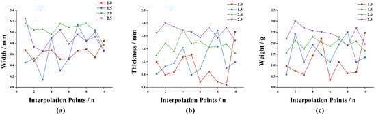 The results of the chip measurements. (a) Width measurement. (b) Thickness measurement. (c) Weight measurement.