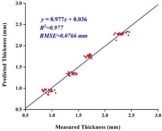 Subsequently, the measured and acceleration values in the three axes were used to calculate the predicted chip thickness values using Equation (5). To assess the accuracy of the predictions, the resulting values were compared with the ground truth data. The comparison results are presented in Figure 15. Specifically, the coefficient of determination () was estimated to be 0.977, and the root mean square error (RMSE) of the predicted values was 0.0766 mm.