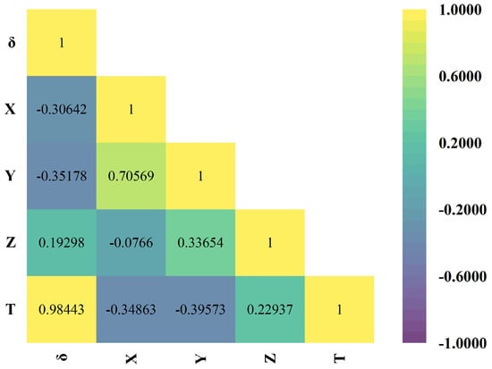 where r indicates the calculated correlation coefficient and N denotes the number of elements in the sample. and represent the values of the corresponding elements in the two samples, respectively. Finally, all correlation calculation results are presented in a heat-map.