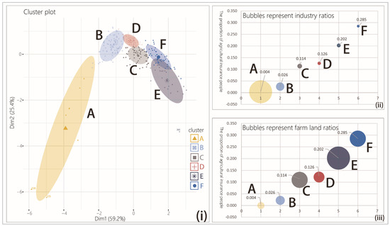 To illustrate the differences between the subsets and their characteristics, after determining the attributes of the subsets of individual LTFAs in the above manner, the number of insured farmers in the six clusters was taken as the vertical axis. The series of six classifications was taken as the horizontal axis. The size of the bubble was used to represent the ratio of industry and commerce in the area corresponding to the classification. The larger the bubble, the higher the degree of non-agriculturalization in the area. It can be seen that the industrialization degree in Clusters A and B near the vertical axis is much higher than that in the other groups, indicating that these two clusters are quite urbanized, where Cluster A belongs to the metropolitan area, and the number of farmers and agricultural land resources is not high (Figure 2ii). Clusters C and D are close to each other in terms of the number of insured farmers, but Cluster C has a higher industrialization degree than Cluster D. Cluster F, on the other hand, has a significantly higher proportion of insured farmers than the other clusters, which also indicates a fairly significant agriculturalization degree.