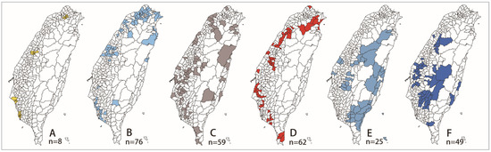 According to the classification of practical organizations based on the six clusters, the two clusters near the left, A and B, are deeply influenced by industrial and commercial development, as they contain a very high proportion of the industrial and commercial sectors but a low proportion of the farming population. Thus, they are named as follows: Cluster A is the urban farming group, and Cluster B is the suburban farming group, indicating that the agricultural business of the area is set for consumption and environmental leisure, respectively. Clusters E and F on the right have the larger agricultural area and a higher proportion of insured farmers. They can be defined as traditional agricultural areas and belong to the farming cluster. There is a clear overlap between the two clusters, indicating that several TFAs may meet their respective conditions in terms of subcluster indicators. Clusters C and D, on the other hand, are between the urban farming cluster and the crop farming cluster and can be defined as the transition farming clusters. Cluster C has more agricultural land resources but a lower proportion of insured farmers, whereas Cluster D has fewer agricultural land resources but a higher proportion of insured farmers. The spatial distribution of the six subsets can be represented in Figure 3.