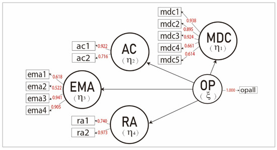 Each structural equation model consists of a measurement model, which considers the relationship between each latent variable and the corresponding variable, and a structural model, which discusses the relationship between the latent variables. In the PLS path modeling framework, the reflective measurement model can be written as [27,56]: