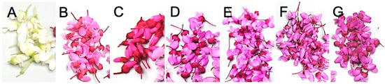 Flowers of C. canadensis cultivars or genotypes: (A) ‘var alba’ (white-type), (B) ‘Crosswick’s Red’ (red-type), (C) ‘Appalachian Red’ (red-type), (D) ‘Traveller’ (purple-type), (E) ‘Ruby Falls’ (purple-type), (F) ‘Forest Pansy’ (purple-type), and (G) ‘Oklahoma’ (purple-type).