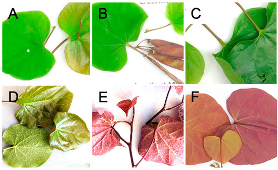 Leaves and petioles of C. canadensis cultivars: (A) ‘Appalachian Red’, (B) ‘Crosswick’s Red’, (C) ‘Traveller’, (D) ‘Oklahoma’, (E) ‘Ruby Falls’, (F) Flame Thrower.