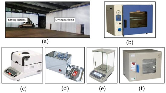 Instruments and equipment: (a) self-made Cyperus esculentus hot air tempering dryer; (b) vacuum drying oven; (c) moisture detector; (d) traditional Chinese medicine slicer; (e) electronic balance; (f) electric drying oven.