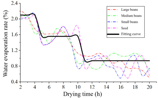 Through the experiment on drying characteristics, the water evaporation of large beans, medium beans, small beans and beans as seeds were obtained. The data were sorted and fitted, and the results were shown in Figure 3.