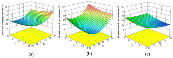 Growth rate of drying uniformity versus: (a) moisture content of Cyperus esculentus at the beginning of tempering and tempering temperature; (b) tempering duration and tempering temperature; (c) tempering duration and moisture content of Cyperus esculentus at the beginning of tempering.