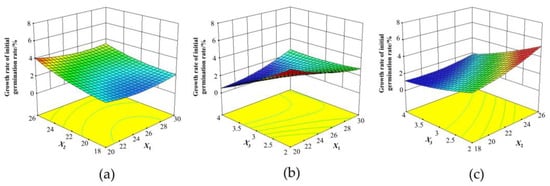 Growth rate of initial germination rate versus: (a) moisture content of Cyperus esculentus at the beginning of tempering and tempering temperature; (b) tempering duration and tempering temperature; (c) tempering duration and moisture content of Cyperus esculentus at the beginning of tempering.