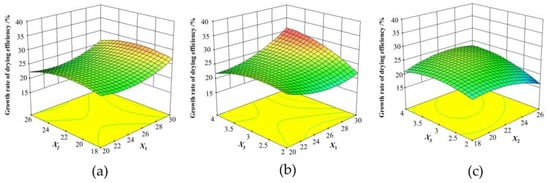 Growth rate of drying efficiency: (a) moisture content of Cyperus esculentus at the beginning of tempering and tempering temperature; (b) tempering duration and tempering temperature; (c) tempering duration and moisture content of Cyperus esculentus at the beginning of tempering.