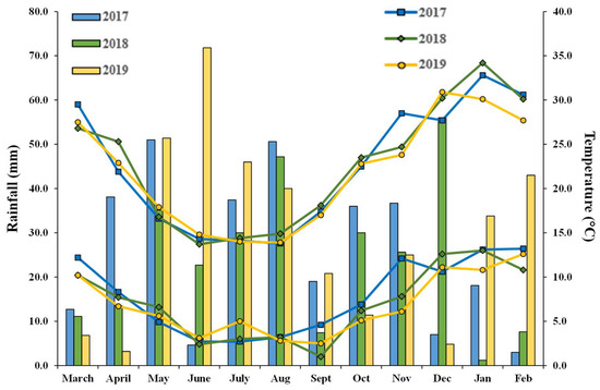 Weather data at the Plant Breeding Centre, Horsham, field site during 2017–2019. Monthly rainfall (bars), average monthly minimum (lower lines), and maximum temperatures (upper lines) plotted for each year.