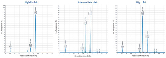Total seed protein and total oil content were determined using near-infrared reflectance (NIR) spectroscopy (Foss XDS Rapid Content Analyser, FOSS Pacific Pty Ltd., Hilleroed, Denmark) [54]. Protein content was calibrated using the Dumas nitrogen combustion method (TruMac, Leco Corporation, St Joseph, MI, USA), while calibration for oil content was facilitated by the Soxhlet extraction method (Soxtec 2050, FOSS Pacific Pty Ltd., Denmark). The fatty acid profile (determination of oleic, linoleic, palmitic, and steric acids) was obtained using NIR spectroscopy (Foss XDS Rapid Content Analyser) [54]. The fatty acid composition was calibrated using reference data obtained from gas chromatography (Agilent GC 7890B, Agilent Technologies, Santa Clara, CA, USA). Briefly, safflower samples were ground using IKA M 20 Universal mill. The oil in ground samples (0.1 g) was extracted with petroleum ether (1.5 mL) at 40 °C for 30 min. The mixture was centrifuged at 1000 g for 5 min and the petroleum benzene solution was decanted and dried at 40 °C under nitrogen stream. The extracted oil was dissolved in toluene (1 mL) and transesterification was performed with 10% sodium methoxide (0.5 mL) for 30 min and subsequently neutralized with 20% citric acid (1.5 mL). The mixture was centrifuged at 2500 g for 5 min. The top organic layer was pipetted into 2 mL vials for gas chromatography. Example chromatographs for high linoleic, intermediate oleic, and high oleic genotypes are shown in Figure 2, which shows labelled peaks for palmitic (16:0), stearic (18:0), oleic (18:1), and linoleic (18:2) acids. Genotypes were classified into three oil classifications based on fatty acid profile: high linoleic (>65% of profile linoleic acid), high oleic (>55% of profile oleic acid), and intermediate oleic (those which fall between the other two classes). Classifications were modified from Dajue and Mündel [1], with ranges extended slightly to account for temperature variability during seed maturation [10] and differing times from maturity to harvest [11] experienced by differing genotypes and across growing seasons.