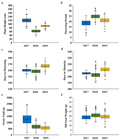 Plant height varied between the seasons from 76.5–177.5 cm in 2017, 36.0–87.0 cm in 2018, and 66.0–110.5 cm in 2019 (Figure 3a). Similarly, DTFS and DTM varied across the seasons, although showing similar trends, with DTF varying between 149–168 DAS in 2017, 144–171 DAS in 2018, and 154–179 DAS in 2019 (Figure 3c); DTM varying between 196–210 DAS in 2017, 191–225 DAS in 2018, and 195–224 DAS in 2019 (Figure 3d); and FP varying between 7–26 days in 2017, 18–33 days in 2018, and 11–28 days in 2019 (Figure 3d). Plants grown in 2017 were taller and produced significantly higher yields, although the initial flowering and maturity periods were decreased (Figure 3). Meanwhile, 2018 plants were considerably shorter and their genotypes flowered for longer but produced significantly lower yields. Plants in 2019 were shorter than in 2017, but taller than in 2018, started flowering and matured later, and produced significantly lower yields (Figure 3). Grain yield per plot also changed between the seasons, varying from 151.75–2430.43 g in 2017, 127.41–1312.66 g in 2018, and 219.11–980.19 g in 2019 (Figure 3e). Although, the 500 seed weight differed little between the seasons, with weights ranging from 12.08–31.07 g in 2017, 13.78–30.70 g in 2018, and 7.8–33.93 g in 2019 (Figure 3f).