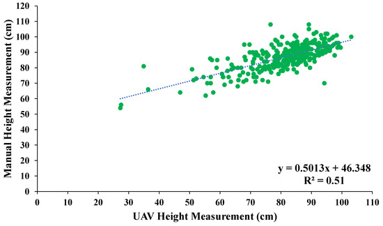 Crop height analysis between manually collected height measurements and UAV-derived height measurements for 2018 and 2019 combined data. Green dots represent individual genotypes in 2018 and 2019 seasons.