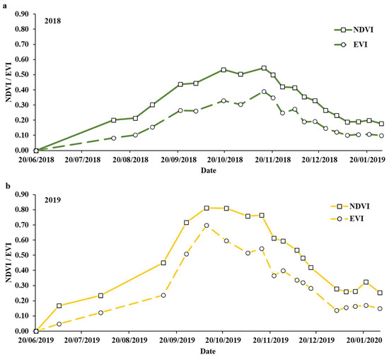 Average NDVI and EVI seasonal profiles for all 200 safflower genotypes from sowing until maturity for (a) 2018 and (b) 2019. NDVI profiles are a solid line; EVI profiles are a dashed lines.