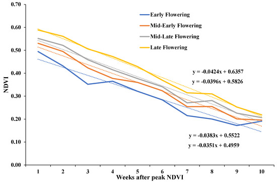 Decay in average NDVI of all safflower genotypes from flowering to maturity. NDVI decay patterns separated by start of flowering classifications, blue-early flowering; orange-mid–early flowering; grey—mid–late flowering; yellow—late flowering, for all genotypes across all three years. Dotted lines illustrate linear trend lines with respective linear equations.