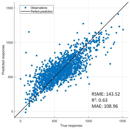 The UAV multispectral images collected were processed using Pix4D Mapper software (www.Pix4D.com, URL accessed on 10 February 2023). The software employs a method known as structure from motion (SfM) which is well-suited for handling UAV data to generate reflectance orthomosaic, digital surface model (DSM), and digital terrain model (DTM) layers. The composite layers were then exported as individual files with a resolution of 2 cm GSD. The MicaSense RedEdge multispectral camera captures reflectance in blue (475 nm), green (560 nm), red (668 nm), red edge (717 nm), and near-infrared (840 nm) bands. These surface reflectance values were used to calculate vegetation indices (VIs), the normalized difference vegetation index (NDVI), and the enhanced vegetation index (EVI). These VIs help to separate the spectral properties of the vegetation from factors that can interfere with the measurements, such as the reflectance of the soil background, particularly during the early stages of the growth cycle. The Gaussian process regression (GPR) model was applied to for grain yield estimation from UAV-multispectral data.