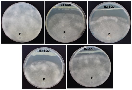 The rhizobacterial isolates were tested for their inhibitory activity against P. aphanidermatum under laboratory conditions. Of the 20 bacterial isolates, four isolates, viz., Pseudomonas indica B2-SQU, Serratia marcescens B3-SQU, Pseudomonas aeruginosa B1-SQU and Pseudomonas brenneri B4-SQU, inhibited the growth of P. aphanidermatum and produced clear inhibition zones (Figure 1; Table 2). None of the other 16 bacterial isolates inhibited the mycelial growth of P. aphanidermatum.