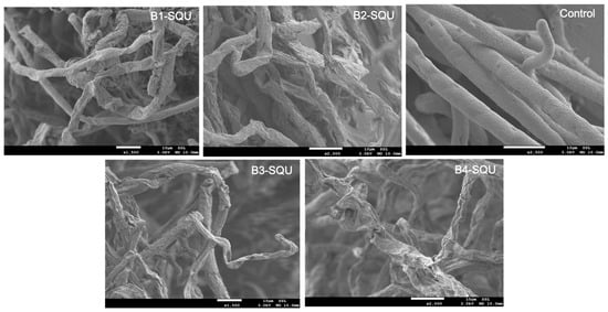 Mycelial discs of 0.5 cm diameter were taken from the periphery of P. aphanidermatum at the inhibition zone in dual culture plates of the effective bacterial strains. Samples were prepared for the scanning electron microscopy according to the method described by Goldstein et al. [52] and were observed with a JEOL scanning electron microscope (Model JSM-7800F; JEOL USA, Inc., Peabody, MA, USA).