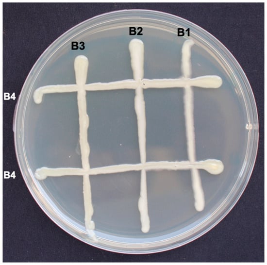 The compatibility between the bacterial isolates from cabbage rhizosphere was evaluated using the in vitro cross-streak method. The results showed that the bacterial strains were compatible as no inhibition was observed in the interjunction. The compatibility of P. brenneri B4-SQU with other bacterial isolates is shown in Figure 3.