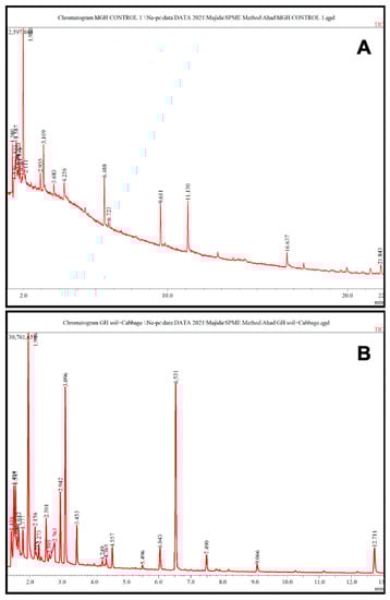 Cabbage plants were grown in pots under greenhouse conditions and the leaves were harvested before the flowering stage and cut into small pieces. Sterilized soil was taken in a solid-phase micro extraction vial of 50 mL capacity, amended with cabbage leaf tissues at the 5% level (wt/wt) and sealed with a polypropylene hole cap and PTFE coated silicone septa. SDW was added into the tube to the final moisture content of 10% (approximately field capacity) and incubated at room temperature (25 ± 2 °C) for 72 h. VOCs released by the rhizosphere soil in the headspace were extracted and analyzed via GC-MS. The GC-MS system used was Shimadzu GC-2010 Plus (Shimadzu), fitted with an Rtx-5MS capillary column (30 m × 0.25 mm, 0.25 μm) attached to a GCMS-QP2010 ULTRA MS as described by Al-Rashdi et al. [25]. The identification of VOCs was conducted by comparing retention time and mass spectra with those of the NIST (National Institute of Standards and Technology) 2011 v.2.3 and Wiley 9th edition mass spectrum libraries.