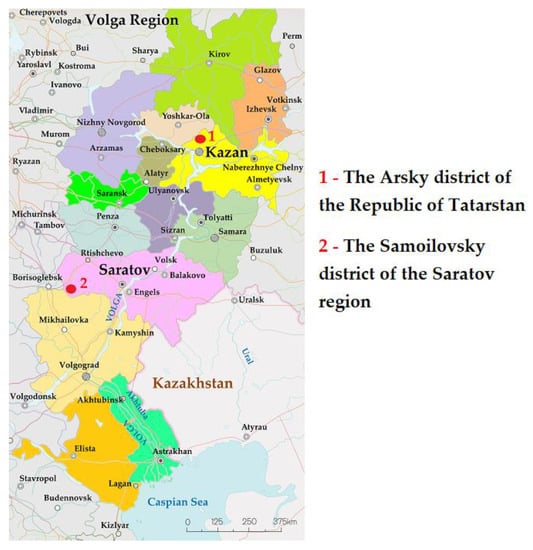 Map of the Volga region that shows areas where pathogen populations were collected (marked with a red circle); original maps taken from Fedorov E.E. https://fedoroff.net/ (accessed on 6 March 2023).