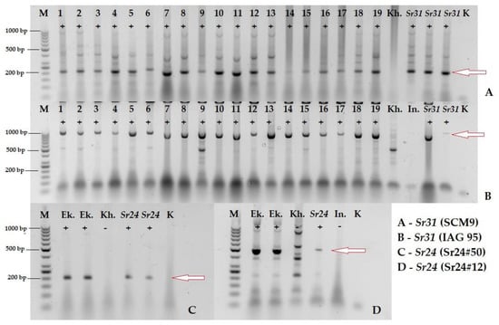 Identification of the Sr31 and Sr24 genes using molecular markers. (A) Identification of the Sr31 gene using the molecular marker SCM 9. (B) Identification of the Sr31 gene using the molecular marker IAG 95: Sr31—cultivar ‘Avrora’, positive control; Khak., In.—cultivars ‘Khakasskaya’ and ‘Inna’ negative controls; №№ 1–19 (the cultivars: ‘100 let TASSR’, ‘Balkysh’, ‘Chistopol’skaya’, ‘Ekada 253’, ‘Ekada 258’, ‘Ekada 265’, ‘Ershovskaya 36’, ‘Kur’er’, ‘Kvartet L 375’, ‘Prohorovka’, ‘Yugo-Vostochnaya 2’, ‘Yugo-Vostochnaya 4’, ‘Antonina’, ‘Bezostaya 100’, ‘Bulgun’, ‘Gurt’, ‘Svarog’, ‘Timiryazevka 150’, and ‘Vekha’); K—control without DNA; M—molecular ladder 50 bp «Thermo Scientific™ GeneRuler™ DNA Ladder»; and the arrow indicates the diagnostic fragment with a molecular weight of 207 bp. (A), the arrow indicates the diagnostic fragment with a molecular weight of 1100 bp. (B); (C) Identification of the Sr24 gene in cultivar ‘Ekada 265’ using the molecular marker Sr24#50: Sr24—cultivar ‘Payne’, positive control; Ek.—cultivar ‘Ekada 265’; Khak.—cultivar ‘Khakasskaya’, negative control; K-control without DNA; M—molecular ladder 50 bp «Thermo Scientific™ GeneRuler™ DNA Ladder»; and the arrow indicates the diagnostic fragment with a molecular weight of 200 bp. (D) Identification of the Sr24 gene in cultivar ‘Ekada 265’ using the molecular marker Sr24#12: Sr24—cultivar ‘Payne’, positive control; Ek.—cultivar ‘Ekada 265’; Khak., In.—cultivars ‘Khakasskaya’ and ‘Inna’ negative controls; K-control without DNA; M—molecular ladder 50 bp «Thermo Scientific™ GeneRuler™ DNA Ladder»; and the arrow indicates the diagnostic fragment with a molecular weight of 500 bp.