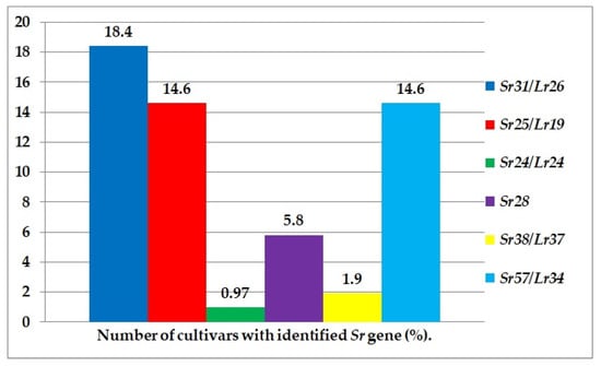 In this study, the Sr31, Sr24, Sr25/Lr25, Sr28, Sr38, and Sr57/Lr34 genes were identified in the analyzed bread wheat cultivars. The Sr genes were not identified in durum wheat cultivars. The resistant durum wheat cultivars may have other genes that are not included in the analysis or some new resistance genes. However, this requires further research to be conducted. The Sr31 gene was identified in 12 cultivars of spring and seven cultivars of winter bread wheat—19 cultivars in total, which accounted for 18.4% of the total number of 103 analyzed bread wheat cultivars (Figure 3).
