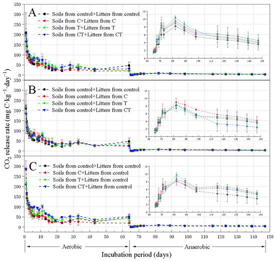 CO2 released rate during the aerobic and anaerobic stage. Control represents the soils or litter that were collected from the ambient atmospheric CO2 without warming; C represents the soils or litter that were collected from elevated CO2; T represents the soils or litter that were collected from plant canopy warming; CT represents the soils or litter that were collected from CO2 plus warming. The letters (A–C) represent Experiment I, Experiment II and Experiment III, respectively. The inset represents the period of flooded incubation from Day 65 to Day 147.