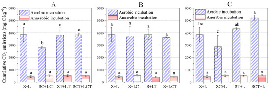 The cumulative CO2 emission during aerobic and anaerobic stage. Please refer to Table 1 for the treatment abbreviations. The letters (A–C) represent Experiment I, Experiment II and Experiment III, respectively. Different lower-case letters indicate significant differences among treatments (p < 0.05).
