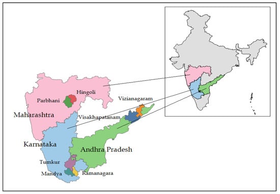 The field survey was conducted during February–May 2019 in three states of India— Andhra Pradesh, Karnataka, and Maharashtra. Based on consultation with agricultural universities in respective states, districts were identified where the NF practice has been adopted by considerable number of farmers. The farmers were selected using snowball sampling in the sample districts. Those farmers who used jeevamritha and did not use any chemical fertilizer and/or pesticide in last one year were considered NF-adopters, while others were non-adopters (non-NF). In each state, two or three districts with a higher proportion of farmers taking up natural farming practices were selected (Table 1 and Figure 1). Non-NF farmers were also selected from the same villages for comparison purposes.