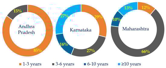 Natural farming has been practiced by farmers in some parts of the country for several decades, though it has recently gained popularity. Among the sampled farmers, 27% of NF farmers in Karnataka had practiced NF for more than ten years. In Maharashtra and in Andhra Pradesh, the majority of NF farmers (66% and 85%) had 3–6 years and less than 3 years of experience, respectively (Figure 2). The government of Andhra Pradesh established Rythu Sadhikara Samstha (RySS), a not-for-profit company in 2014. RySS implements community managed natural farming in the state which has resulted in the adoption of NF by a large number of farmers in the state in recent years.