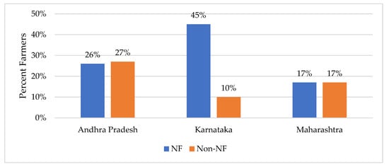 The low percentage of inter-/mixed cropping is due to the fact that paddy is the major crop in the study area and is preferably cultivated as a single crop. Karnataka (45%) had the highest rate of inter/mixed cropping among the study states. It was observed that almost the same proportion of farmers in Andhra Pradesh and Maharashtra practiced inter/mixed cropping in both NF and non-NF. However, in Karnataka, only 10% of non-NF farmers practiced inter/mixed cropping.