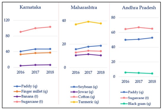 In case of black gram in Andhra Pradesh, NF without FYM had a significantly lower yield than NF with FYM (At p < 0.1). Moreover, in the case of paddy in Karnataka, NF without FYM had a significantly lower yield than non-NF as well as NF with FYM (At p < 0.05). The difference in yield could not be established in other cases due to the absence of a critical number of farmers adopting different practices. During the field survey, crop yield over the previous three years with the NF farmers was also explored. It was carried out to see if the yield of important crops grown under NF in the past had improved or not. Almost all of the crop yields were found to be more or less consistent in all three states over the three years 2016–2018 (Figure 5).