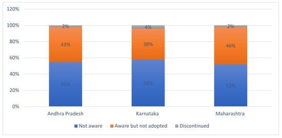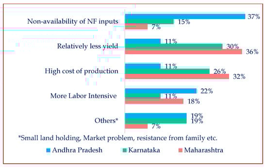 Though farmers perceived several benefits out of NF practice, more than 50% farmers among non-NF category in three selected states were not yet aware of NF. However, only 2–4% farmers discontinued and reverted to the conventional system of farming owing to no obvious benefits of NF (Figure 6). Lower crop yield and no immediate control over pests and diseases were found to be the reasons for discontinuation. Decreased landholding and no proper support from family members were also the reasons for discontinuation in a few cases.