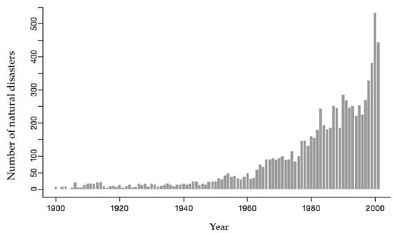 The number of natural disasters is also increasing with climate change (Figure 1). The number of natural disasters in Europe has increased since the 1990s. The number of global natural disasters is three times bigger compared with that 40 years ago, and the economic losses have increased by five times. Presently, the number of insurance damages per year is equal to the number of all the damages per decade of the 1960s. Presently, there is just a partial or no possibility of using insurance services in the regions that are devastated heavily [14].