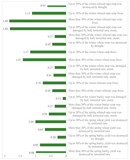 The main risks faced by farmers in the western part of Lithuania are frost, rain, hail, storm, and drought (Figure 2). Frost, which occurs on average every three years, is the most important cause of losses for farmers, with losses fluctuating between years. However, it can be noted that the incidence may vary from one district to another, with some being less affected and others more affected, but frost as a phenomenon affected the areas of all farmers surveyed. It can be said that meteorological events cause the greatest damage to winter oilseed rape crops, followed by winter wheat, triticale, and spring crops, and summer crops experience less damage. The damage caused by meteorological events is more often observed by farmers who take crop insurance.