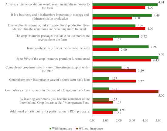 Summarising the survey data, farmers who have insured or are currently insuring their crops indicate that the main reason why they are currently insuring their crops is to take advantage of the support provided by the government (reimbursement of up to 50% of the crop insurance premium), which is very important for all farmers. It was observed that insured farmers assess the risk of meteorological phenomena and also indicate that adverse weather conditions would result in significant losses to the farm, and this is a very important reason for using crop insurance. According to the farmers who take crop insurance, agriculture is a business, and therefore, it is important to manage risks and minimize crop losses caused by nature. These three reasons are the main drivers for farmers to actively use crop insurance products. The least important reasons that would encourage farmers to take crop insurance are the compulsory nature of short-term (an average of 1.27), long-term (an average of 1.27) bank loans, or the Rural Development Programme (RDP) support (an average of 2.21). There was a negative correlation between compulsory insurance when receiving investment support under the RDP and the duration of insurance (−0.348 **, p > 0.05) (Appendix A.13). It could be argued that compulsory insurance is more of a disincentive than an incentive for farmers to insure their crops. It also reveals an association between compulsory insurance for short-term and long-term bank loans and the duration of insurance (0.804 **, p > 0.05). It can be argued that although it will be compulsory to insure crops, according to the farmers, it would not really be an incentive but simply a compulsory thing to be performed. Therefore, it can be assumed that former customers may not continue to insure their crops after the end of their contracts.