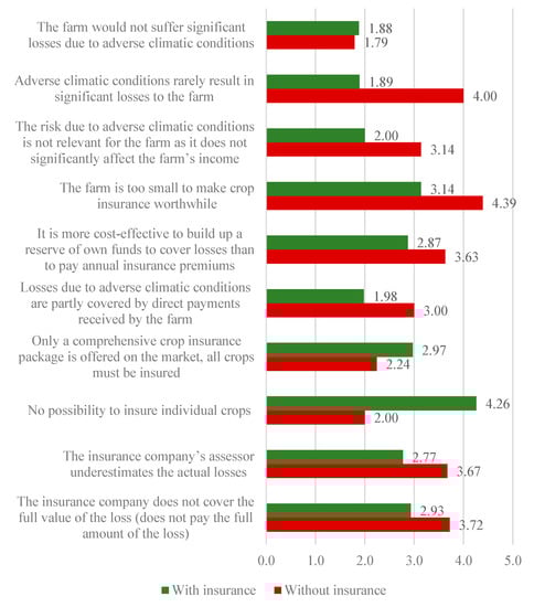 Farmers who take crop insurance consider their losses to be higher, while farmers who do not take crop insurance consider their farms to be less likely to suffer losses. This suggests that farmers have different perceptions of farm losses and their consequences for the future of the farm. According to the average, the most important reason for not insuring crops is that direct payments cover the losses incurred. However, farms that do take insurance consider this to be a minor reason for hesitation.