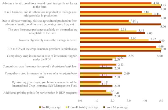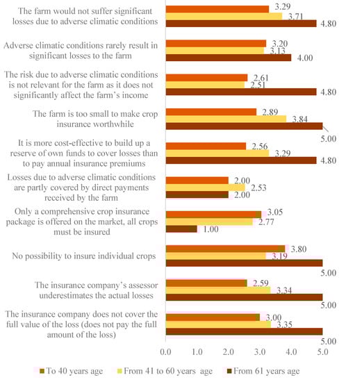 It is noticeable that farmers who do not take crop insurance emphasize that crop insurance is not important for the farm because the farm is too small and the farm does not suffer a lot of damage due to meteorological events. It is also pointed out that farmers who have never been insured evaluate the performance of the insurance company: the work of the claim experts and the insurance company’s compensation system. It can be assumed that they are not well acquainted with the activities of the insurance company and rely on unconfirmed sources. Farmers who currently insure crops stress the need to look for ways to improve the insurance product to cover individual crops and to find new players in the insurance system. The reasons for the hesitation of farmers of different ages to take crop insurance are given in Figure 6.