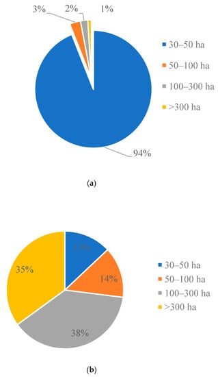 (a) Structure of farms in Lithuania in 2018 [28]. (b) Structure of farms that insure their insured their crops in 2020.