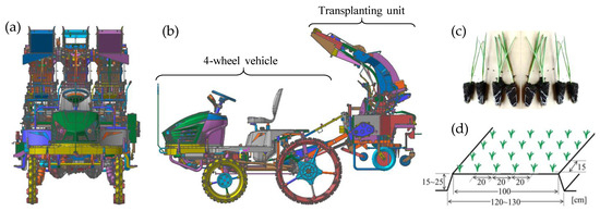 A three-dimensional model of the considered onion transplanter is shown in Figure 1a,b. It is a combination of two main units: a 12 kW self-propelled riding-type four-wheel vehicle and an onion transplanting system. The physical features of the prototype onion transplanter are listed in Table 1. The whole transplanting activity is also a combination of three major processes (mechanisms): (a) seedling picking (extraction mechanism), (b) supply (conveying mechanism), and (c) dibbling (planting mechanisms). The onion cell trays were initially placed in the seedling trays. The onion seedlings (Figure 1c) are retrieved from the growing cell seedling tray and placed on the conveyor belts using the pushing rods. Seedlings were transported into the planting hopper by the conveyor mechanism and implanted in six rows according to the seedling planting mechanisms. All of these units are sequentially interlinked. A total of three individual units run together and transplant six seedlings in a row. Finally, two axillary pressing wheels (a total of twelve for six rows) squeeze the earth to keep the seedlings upright and the mulch layer from being damaged. Figure 1d shows the transplanting pattern with dimensions.