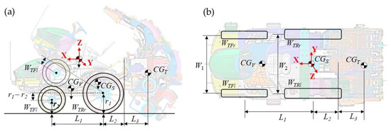 The mass of the 4-wheel vehicle, transplanter (vehicle + transplanting unit), transplanter with an operator, and transplanter with an operator and carrying load were 575, 1145, 1225, and 1265 kg, respectively. The mass holding ratios by the front- and rear-axles of the whole transplanter, the whole transplanter with an operator, and the whole transplanter with an operator and carrying load under the regular condition were 30.66%:69.34%, 34.045%:65.96%, and 35.49%:64.51%, and under the front axle lifted condition were 19.13%:80.87%, 21.96%:78.04%, and 23.72%:76.28%. Similarly, the mass ratios between the left- and right-sided wheels of the whole transplanter, the whole transplanter with an operator, and the whole transplanter with an operator and carrying load under the normal condition were 50.92%:49.08%, 51.18%:48.82%, and 51.15%:48.85%, and under the front axle lifted condition were 51.35%:48.65%, 51.43%:48.57%, and 51.46%:48.54%. According to Equations (1)–(3), the calculated CGV coordinates (XV, YV, and ZV) of the 4-wheel vehicle were 1016.34, −488.02, and 1188.86 mm, respectively. On the other hand, based on Equations (4)–(6), the CGT coordinates (XT, YT, and ZT) of the whole onion transplanter system for different load conditions and mass distributions are mentioned in Table 2.