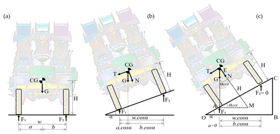 According to the road and off-road vehicle system dynamic [23,28,29,30], a rollover is one kind of vehicle incident where the vehicle tips over in its lateral or longitudinal direction. A static rollover occurs due to the transference of CG, and the CG is related to the mass of the vehicle. If the mass of the considered onion transplanter is mt on a horizontal surface and acting through the CG, considering the gravitational constant (g), the mass force of the onion transplanter will be G = mtg. Let F1 and F2 be the ground reaction forces on the right- and left-sided wheels of the vehicle, H be the vertical distance from CG to the ground, and w be the wheel track, as shown in Figure 3a. Equations (7) and (8) explain the relationship between G and the reaction forces operating on the wheels.